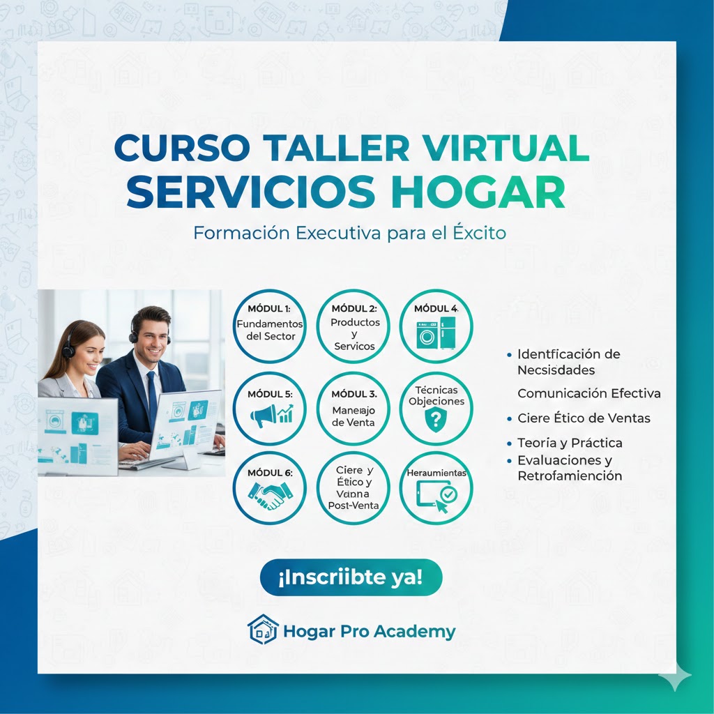 El Curso Taller Virtual de Servicios Hogar está diseñado para formar ejecutivos/as altamente capacitados en la identificación de necesidades del cliente, la comunicación efectiva de beneficios y el cierre ético de ventas. A lo largo de seis módulos, el participante conocerá la terminología esencial del sector, los productos y servicios disponibles, técnicas profesionales de venta, manejo de objeciones, estrategias de cierre, servicio al cliente y el uso de herramientas digitales. El curso combina teoría, actividades prácticas, evaluaciones y retroalimentación para garantizar un aprendizaje integral orientado a resultados.